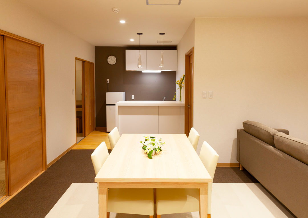 ご遺族にゆっくりとおくつろぎ頂けるリビングで、ご遺族が故人様に付き添い宿泊もしていただけるお部屋もご用意しております。